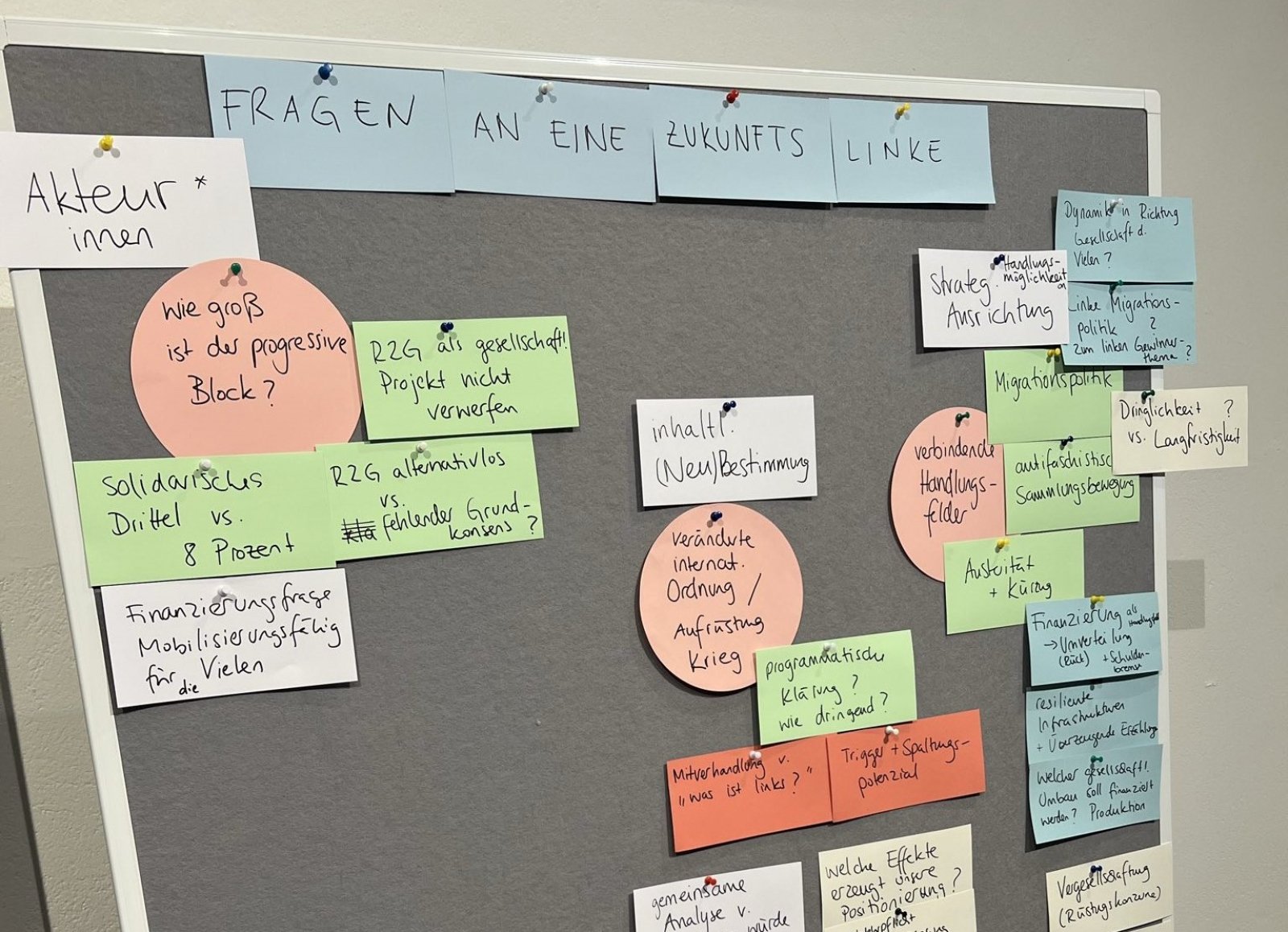 Begonnen haben wir am 15.3. mit dem Zusammentragen unserer Einschätzungen der Lage sowie der Krisen und Erschütterungen linker Strategie und Praxis, die damit verbunden sind. Geredet haben wir darüber, wo „wir“ feststecken, aber auch wo sich etwas bewegt und wo Mehrheiten für solidarische Politik in Sichtweite geraten. Für uns war dabei weniger interessant, uns vorschnell auf „gemeinsame programmatische Leitplanken“ oder das „richtige“ Politikfeld zu einigen, als vielmehr das Augenmerk gerade auf die gesellschaftlichen Widersprüche (z.B. sozial-ökologische Politik & Umverteilung), politischen Konflikte (z.B. globale Verschiebungen & internationale Solidarität) und potenziellen Blockaden (z.B. Demokratie & Migrationsgesellschaft) zu legen: Widersprüche, die es uns erschweren, eine Perspektive für eine andere als die gegenwärtig zu befürchtende Zukunft einzunehmen und mögliche Pfade dorthin mit politischen Akteur:innen und Projekten zu untersetzen.